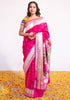 Rukmini captures the sacred beauty of temple chambers where pink Katan becomes liquid poetry and Kadhua artistry blooms like precious blessings dancing in divine light. This magnificent masterpiece showcases the exquisite Kadhua technique—where divine motifs create symphonies of spirituality and light, transforming silk into a living testament that celebrates the marriage of traditional artistry and sacred sophistication.